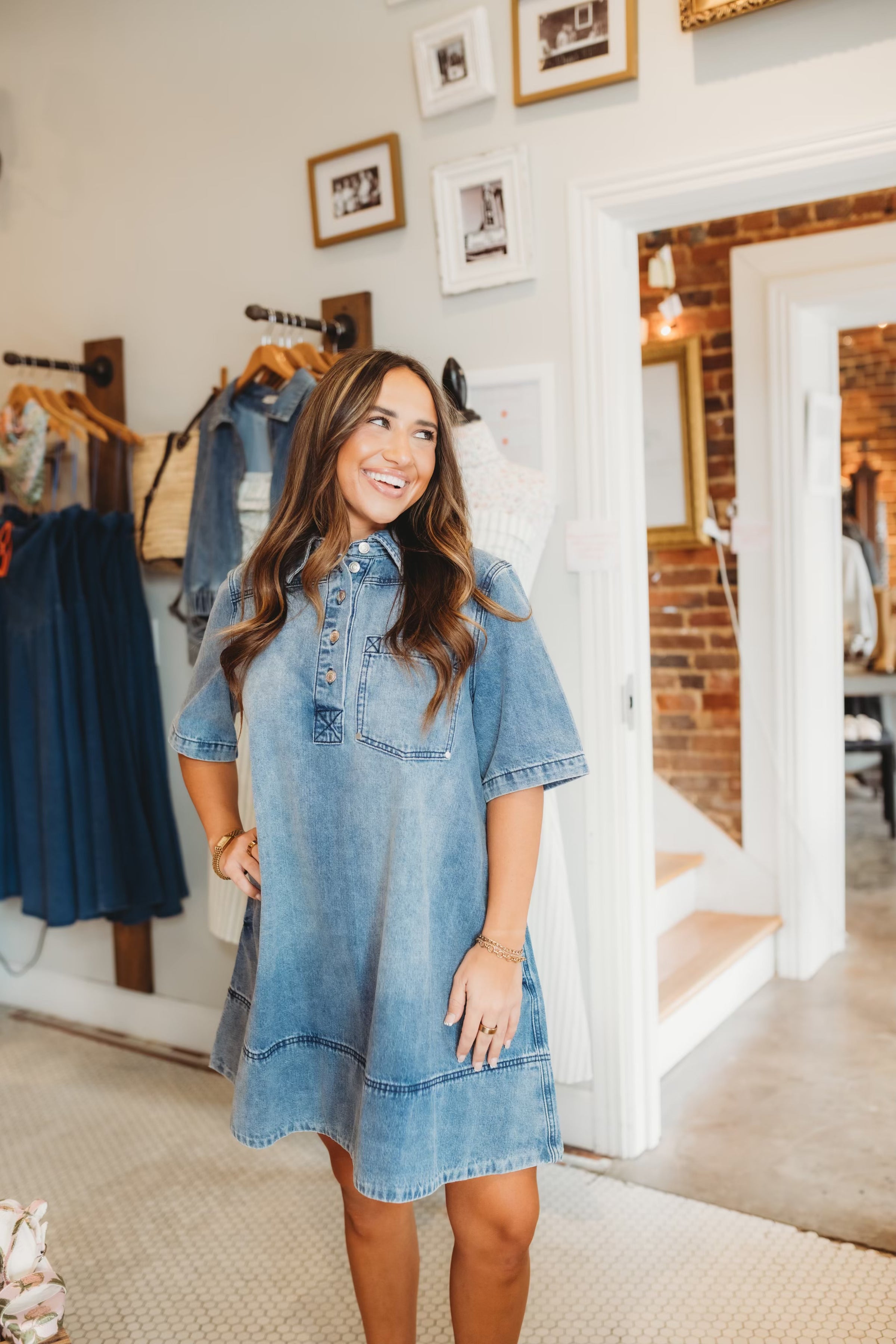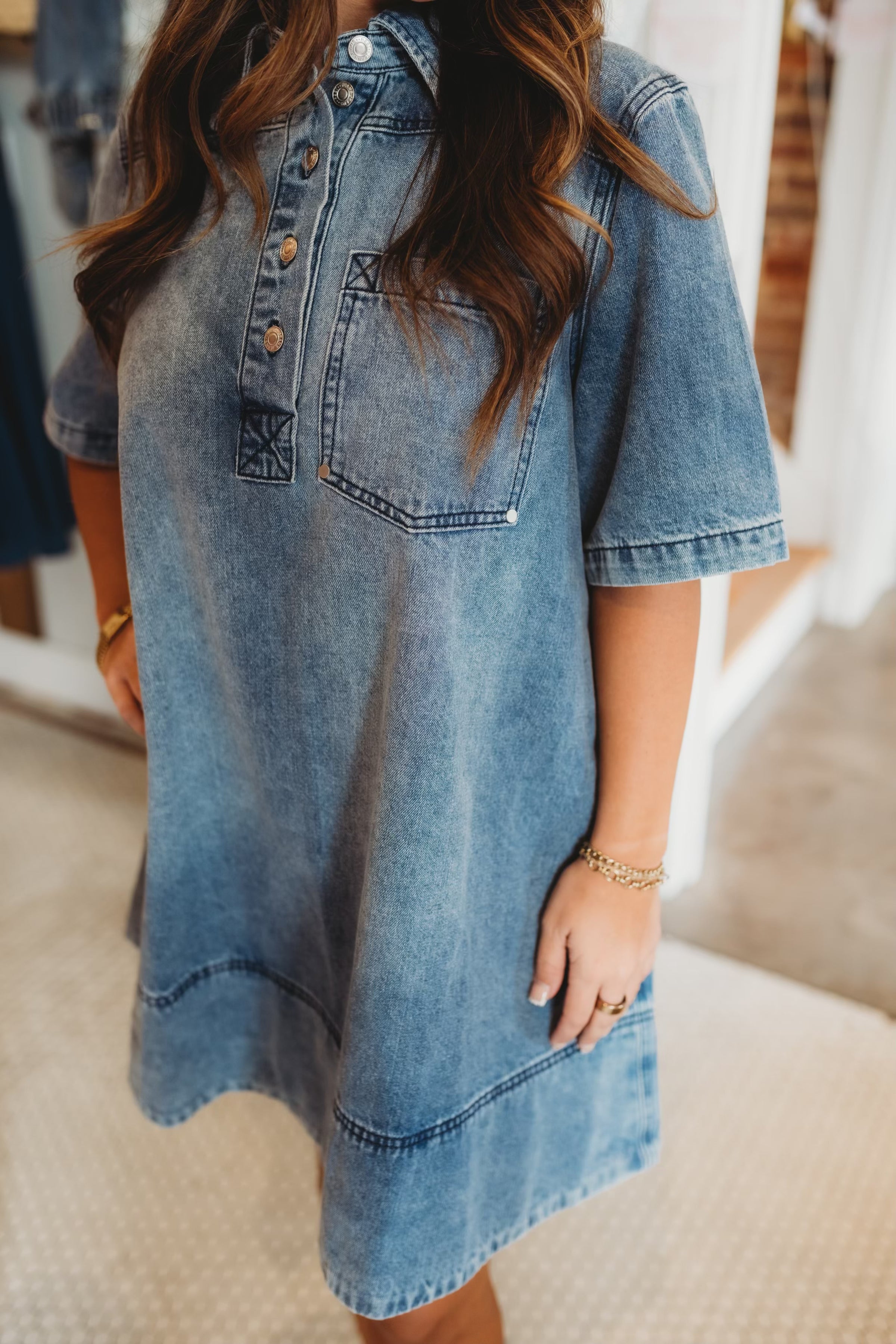 Playful and effortlessly chic, the Megan Denim Mini Dress blends retro-inspired style with contemporary flair. The classic A-line silhouette flatters every frame while the flared skirt moves freely with you. Washed denim details create a relaxed, vintage-worn aesthetic that feels both polished and casual. Perfect for casual days, weekend adventures, or dressed-up evenings—this versatile mini transitions seamlessly from day to night.