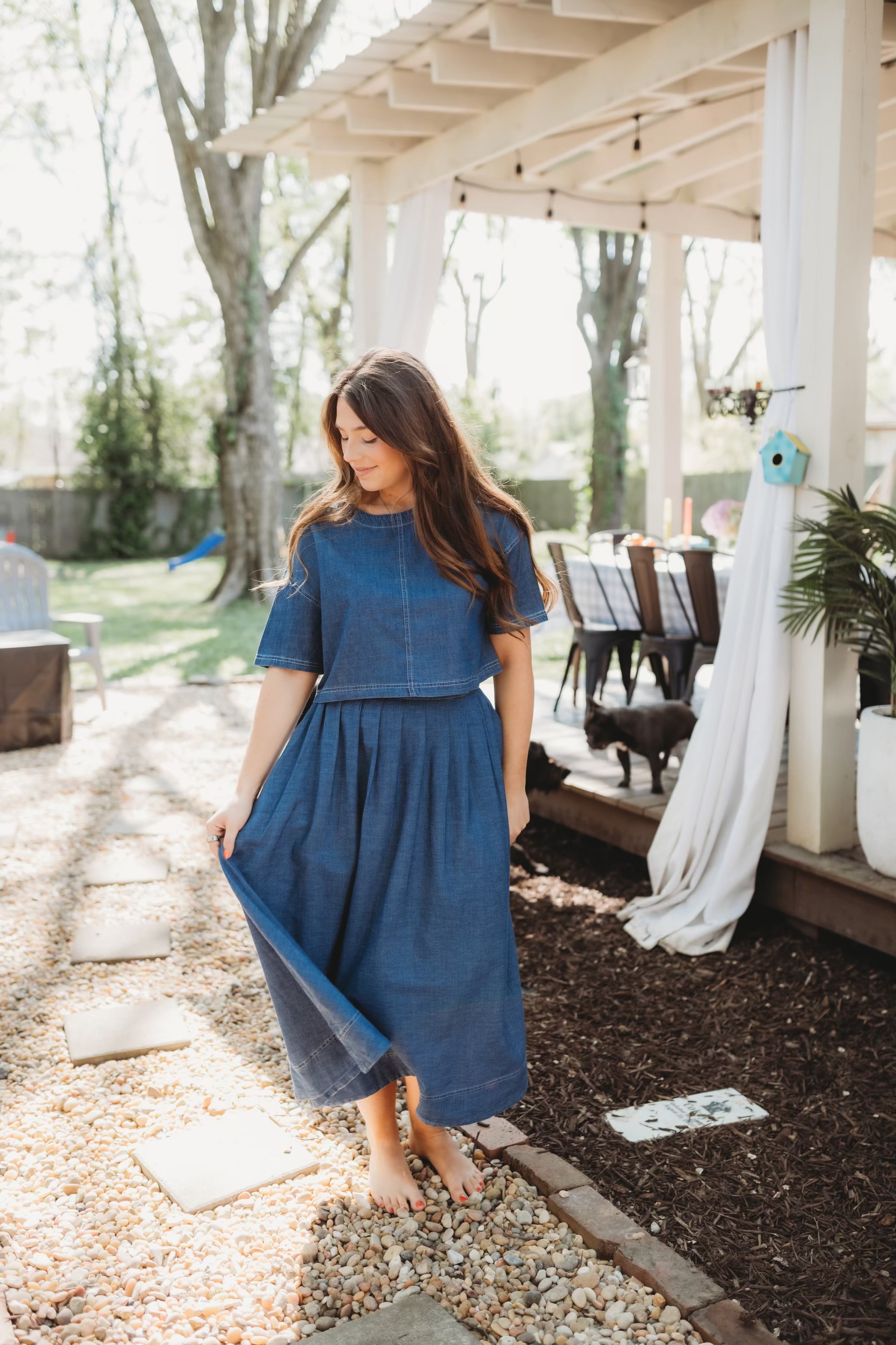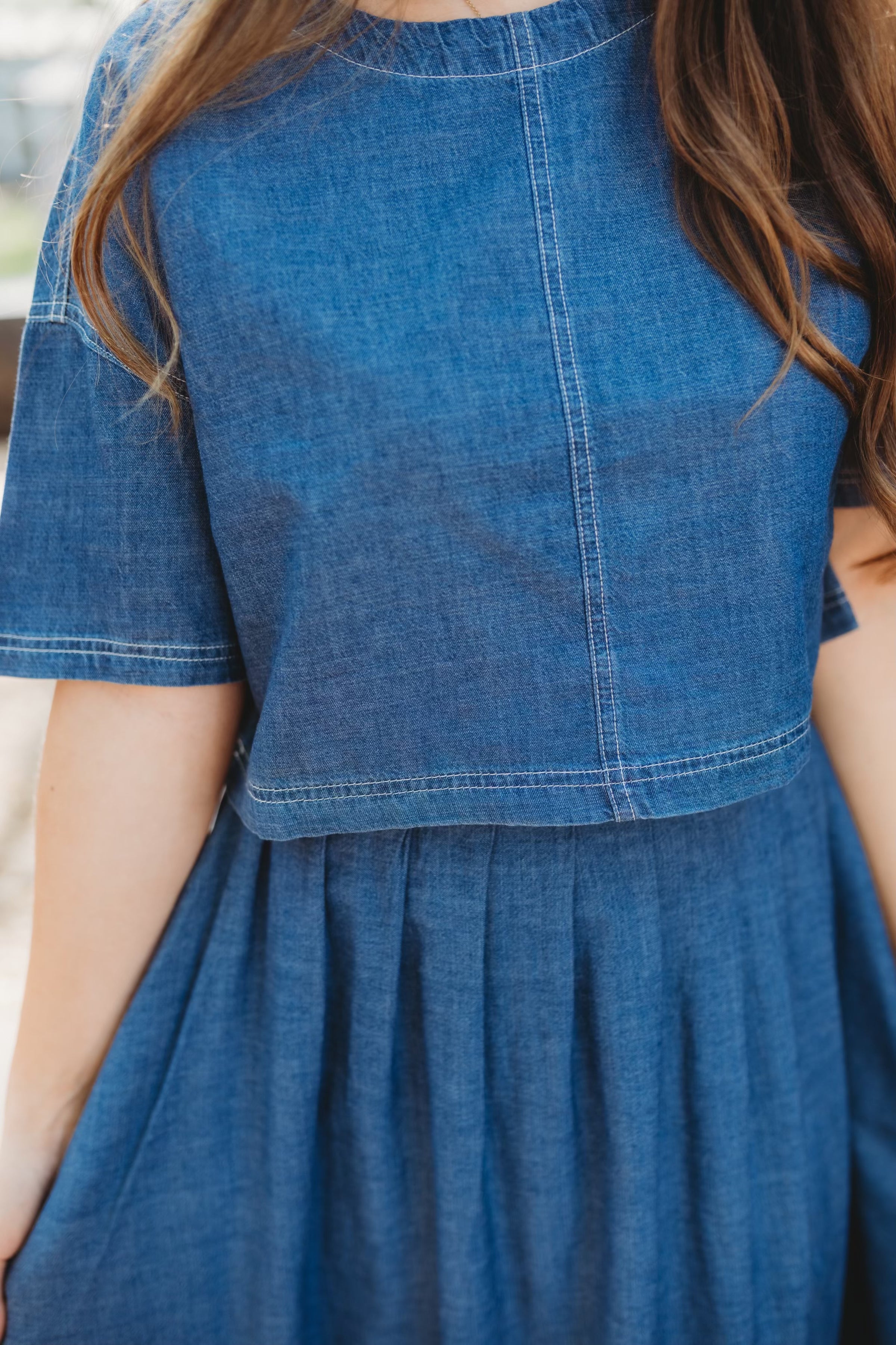 Effortless spring style meets timeless denim in this charming cropped top. The Dolly features a classic round neckline, short sleeves, and a playful back button detail that adds personality to any outfit. Perfect for layering or wearing solo, this woven denim piece is a versatile wardrobe essential for the season ahead.
