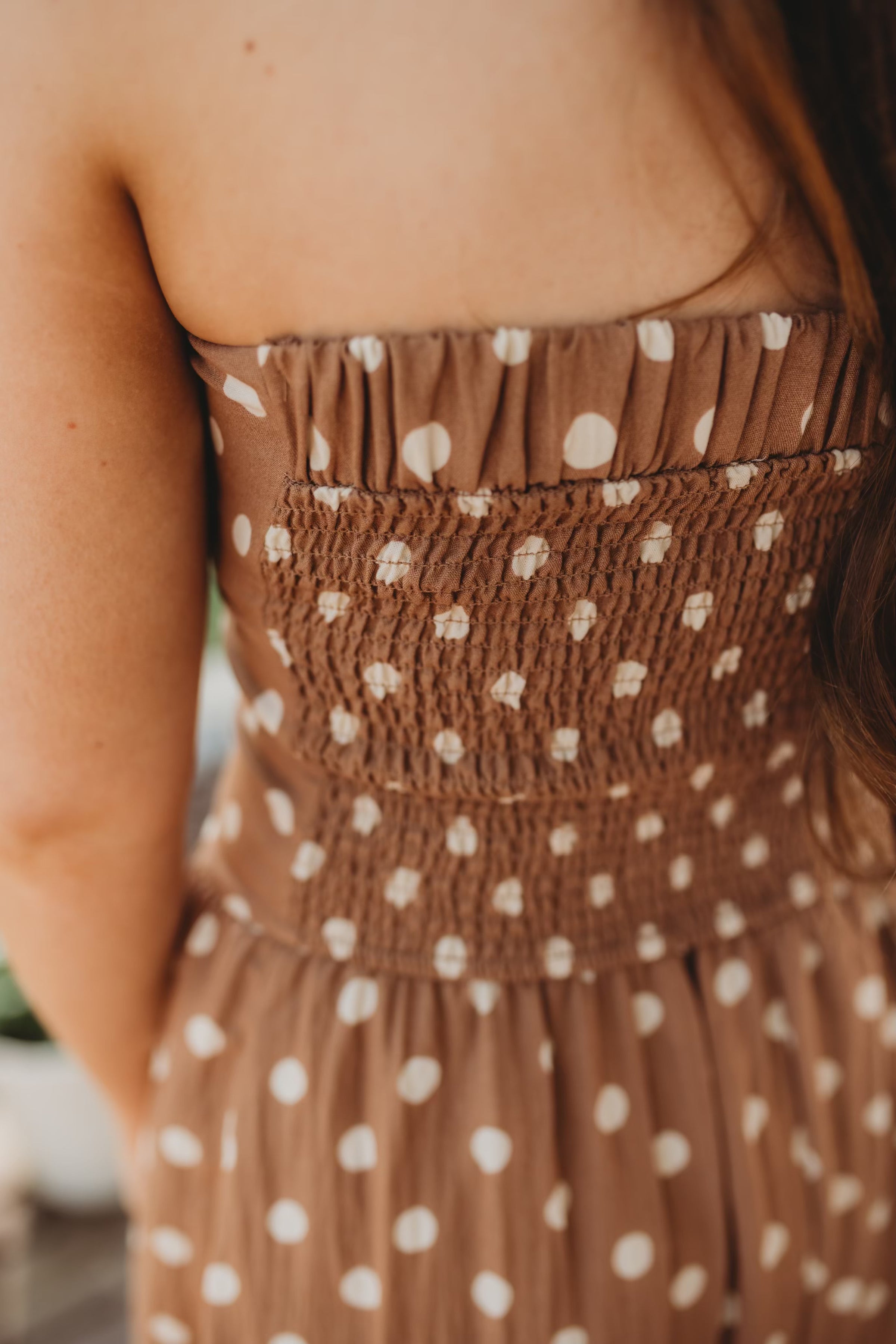 Effortless spring elegance in a charming polka dot strapless mini dress. The fitted bodice features delicate back smocking that adds texture and movement, while the A-line silhouette flatters every figure. Fully lined for comfort and confidence. Perfect for garden parties, brunches, or casual outings this season.