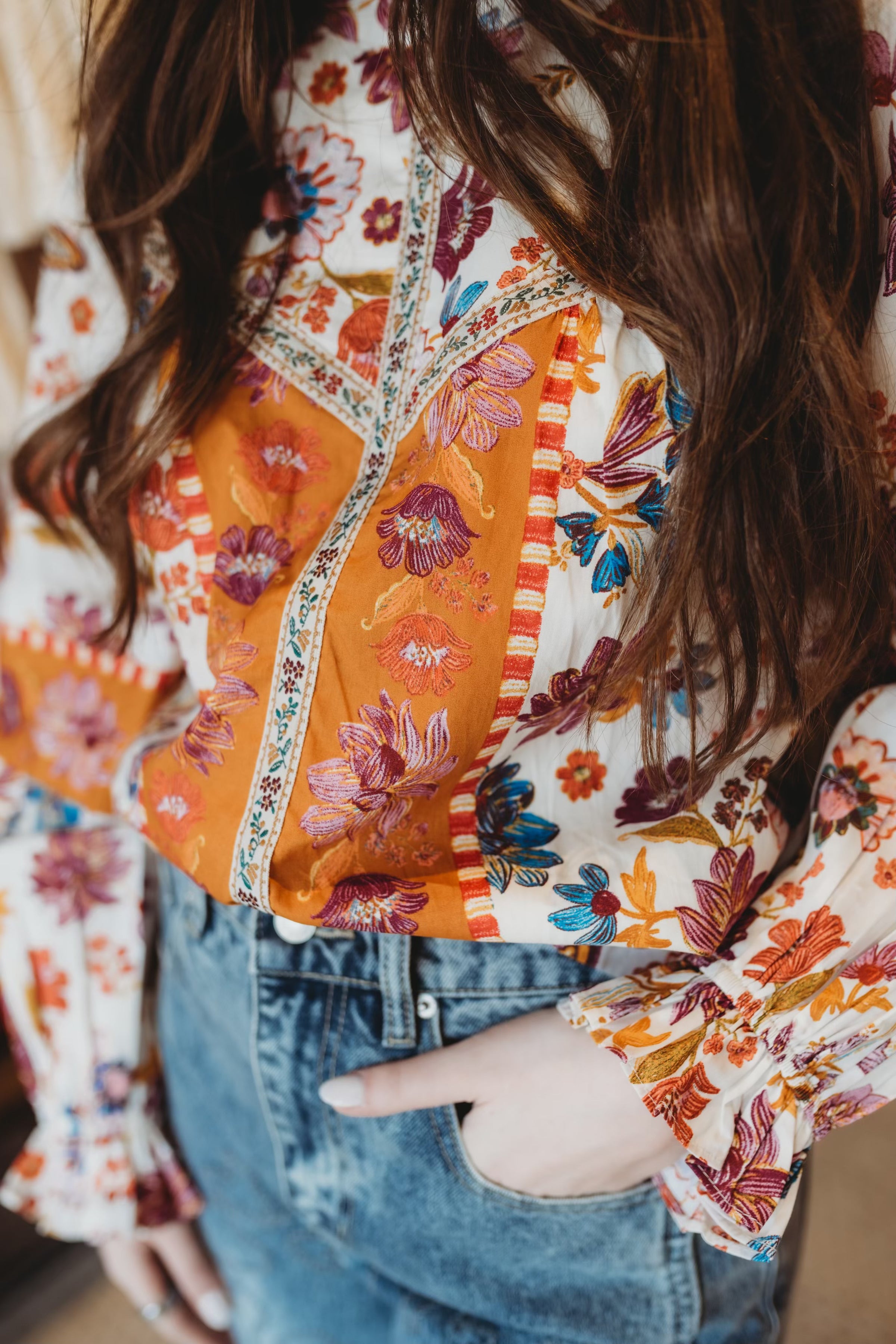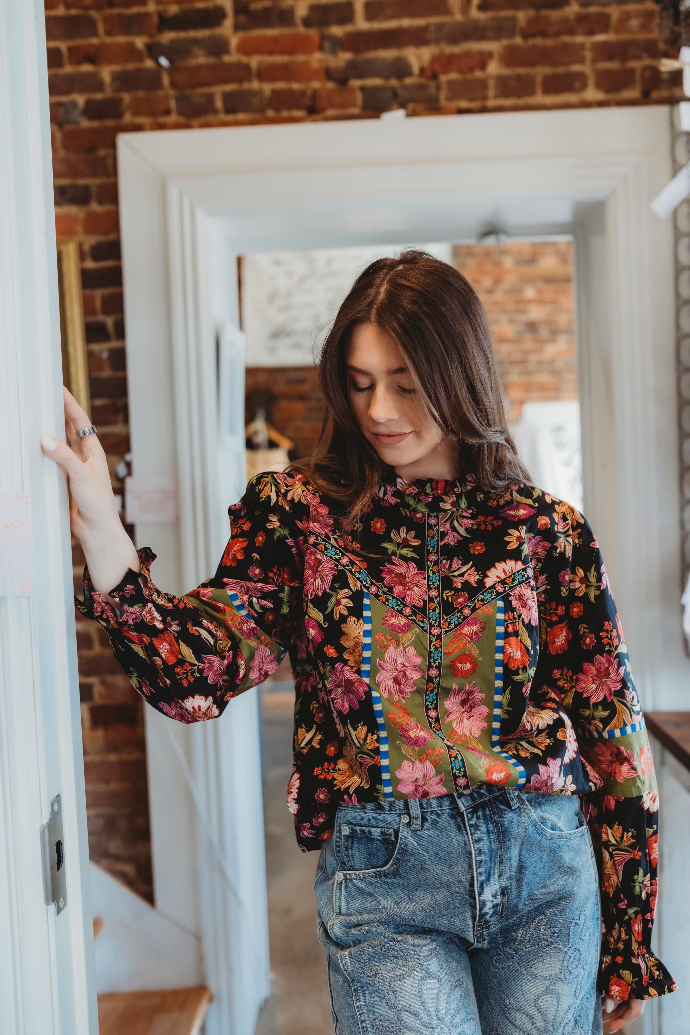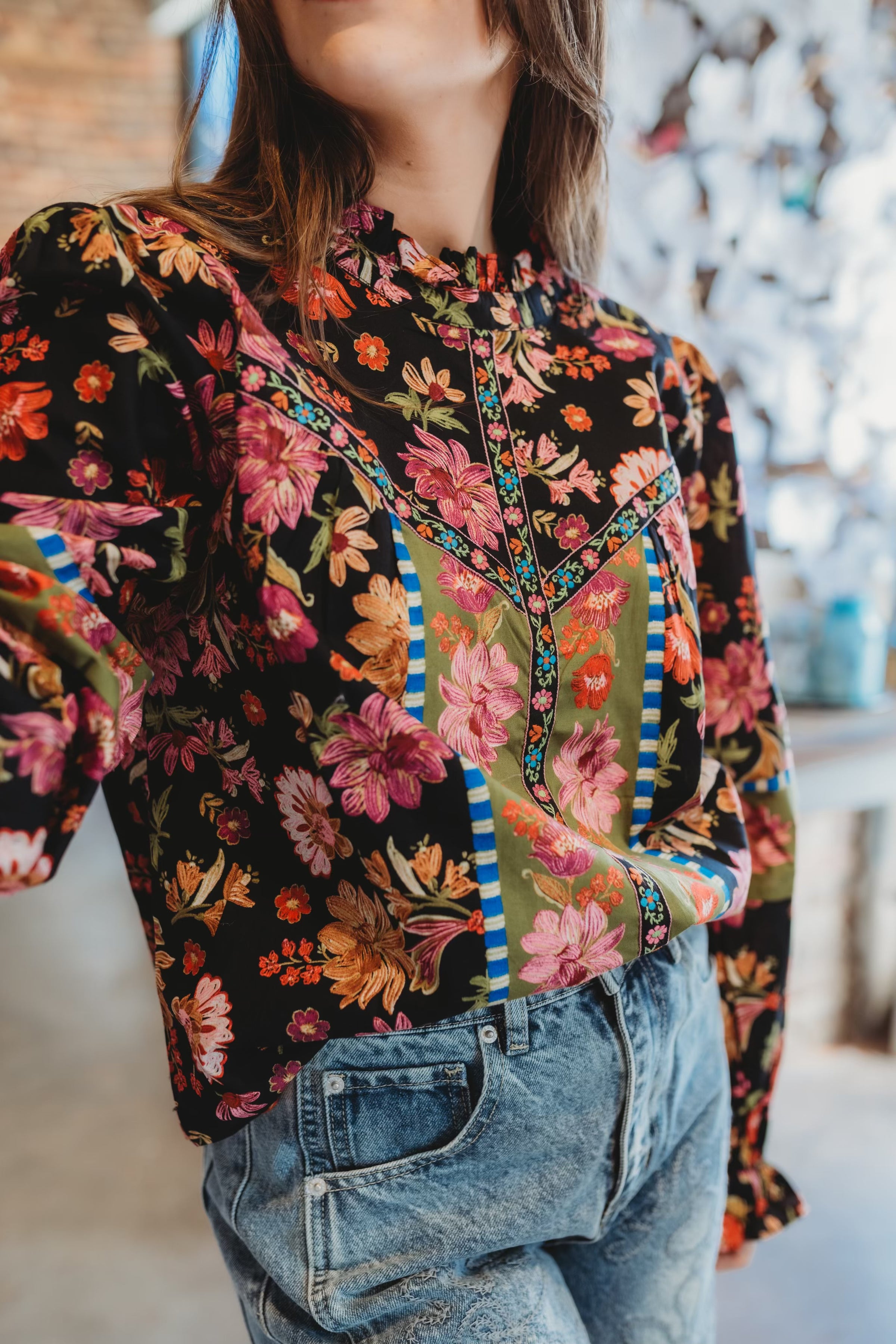 Embrace romantic style with this charming floral bordered top, exclusively designed with &merci's signature print. Features a delicate ruffled neckline and long balloon sleeves finished with ruffled elastic cuffs for an effortlessly elegant look. The front bodice showcases beautiful floral trim detailing, while the lined construction ensures comfort and coverage. A keyhole back with button closure adds a sophisticated finishing touch to this versatile piece.