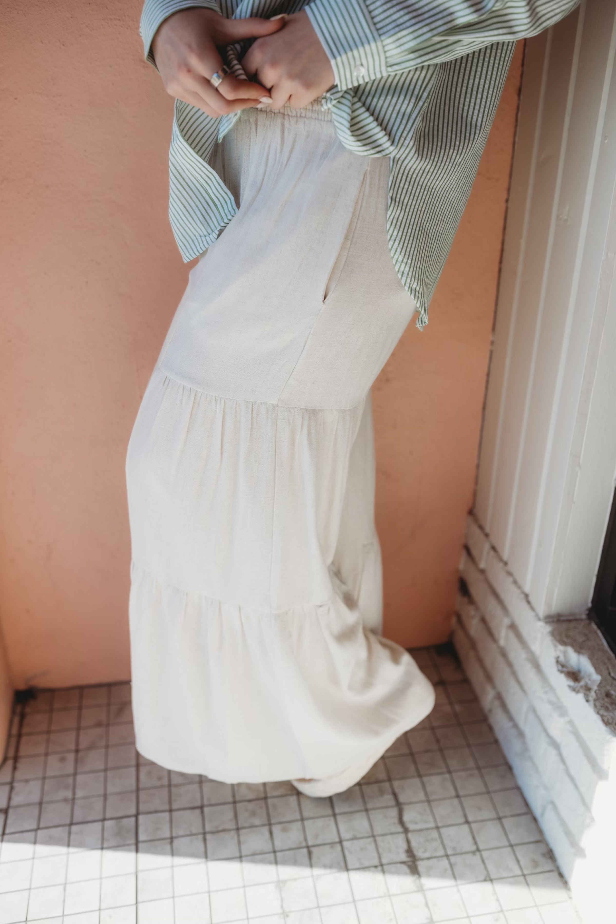 Embrace the season in these effortless Natalie Natural Linen Pants. Crafted from a soft linen blend with a comfortable elastic waist, they feature a flowy tiered silhouette perfect for spring days. Breathable, versatile, and undeniably chic—your new go-to for casual elegance.