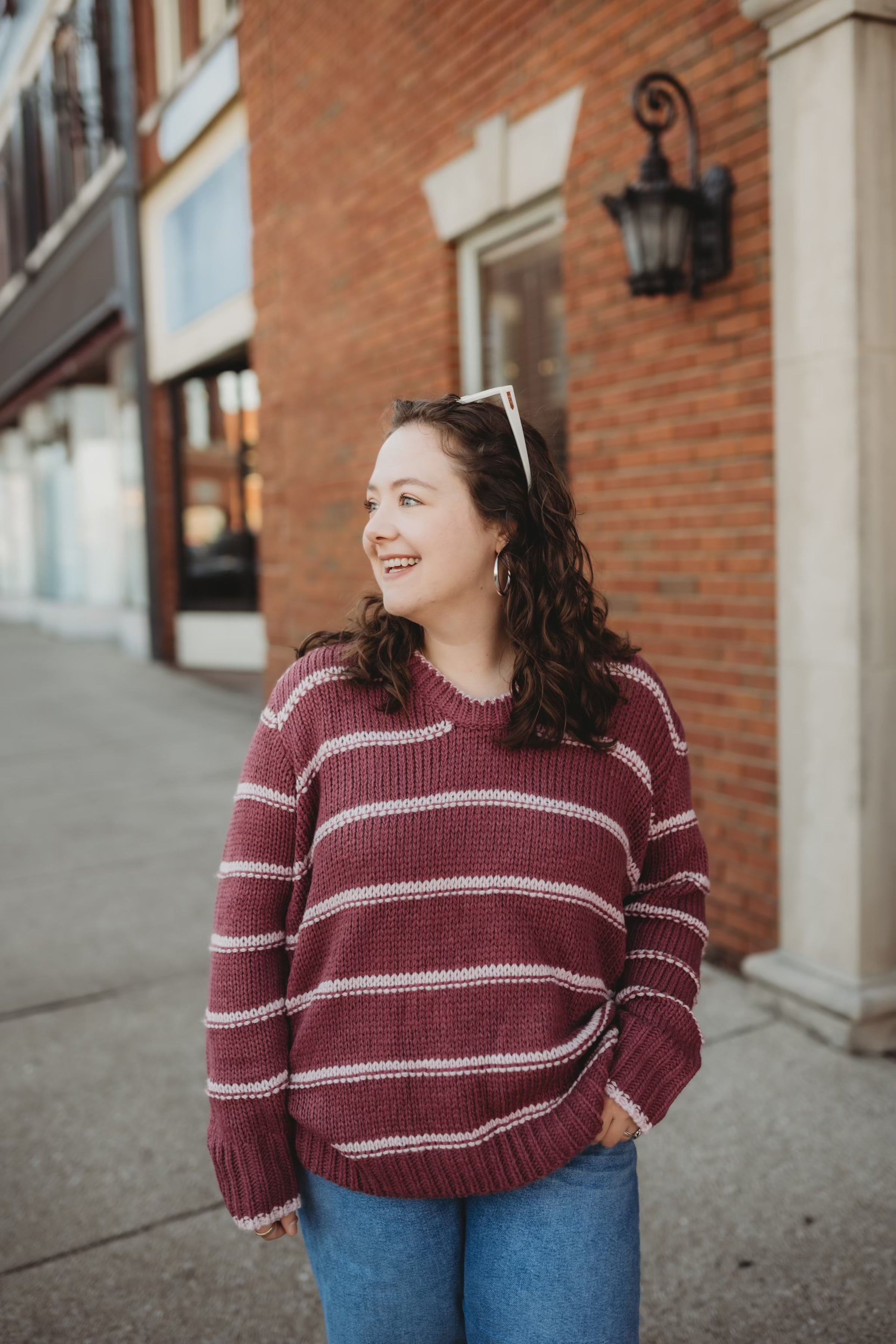 Wrap yourself in comfort with this Candy Striped Sweater in muted marsala. The charming striped design brings effortless style to your everyday rotation, while long sleeves deliver warmth through the seasons. Layer it over basics or wear solo—this piece transitions seamlessly from casual outings to relaxed gatherings with friends. The soft, versatile construction pairs beautifully with denim, leggings, or skirts, making it a reliable favorite you'll reach for again and again. Perfect for building a wardrobe that feels both intentional and comfortable.
