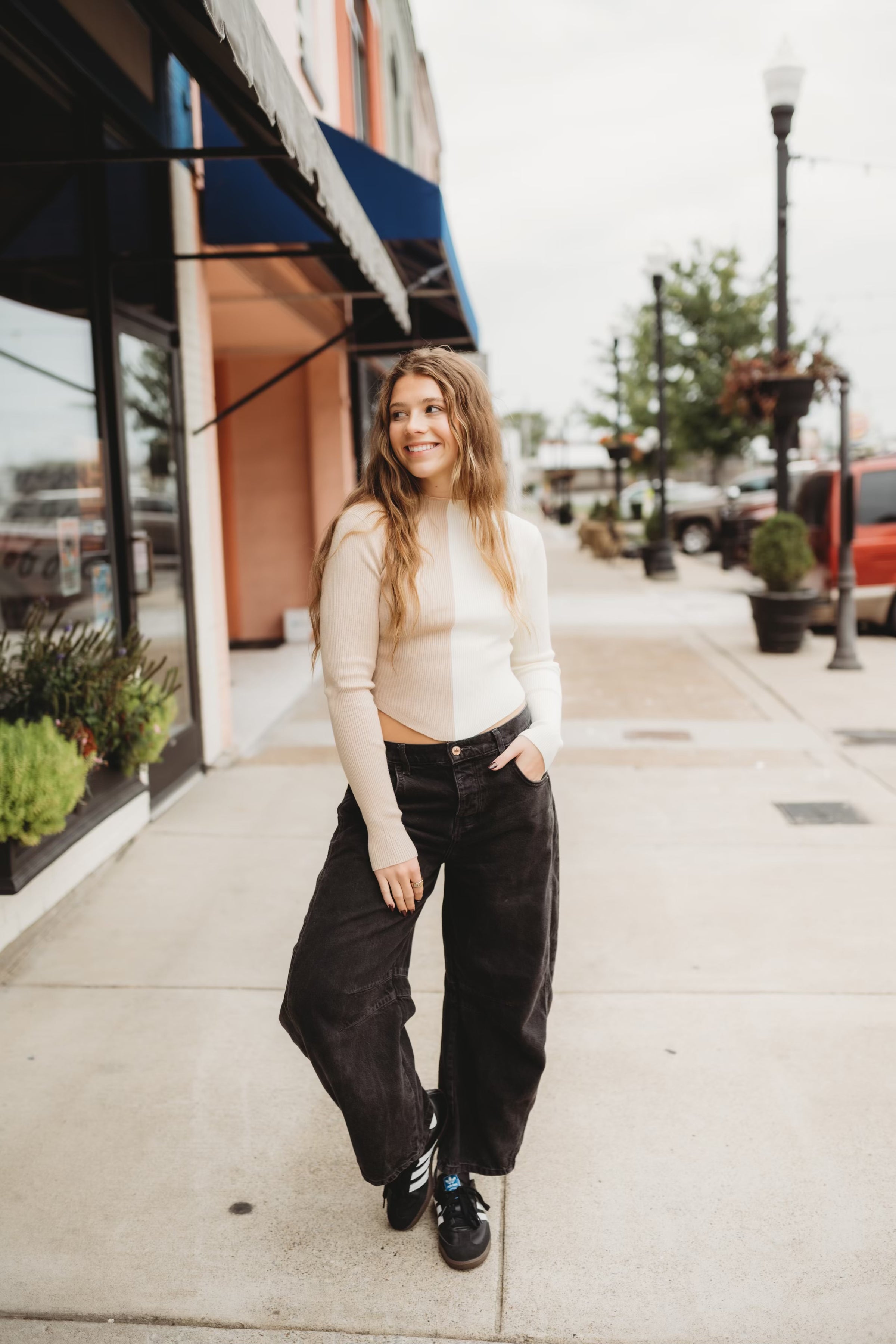 This elegant dual-tone sweater is crafted from a premium ribbed knit fabric, combining comfort and style effortlessly. Its fitted shape, long sleeves, and high neckline highlight a sleek silhouette. The soft beige and cream hues offer versatility, making it suitable for layering or wearing on its own. The smooth color transitions and textured ribbing enhance its minimalist yet sophisticated look. Perfect for both casual and semi-formal settings, this sweater delivers a modern design with a comfortable fit you can rely on.